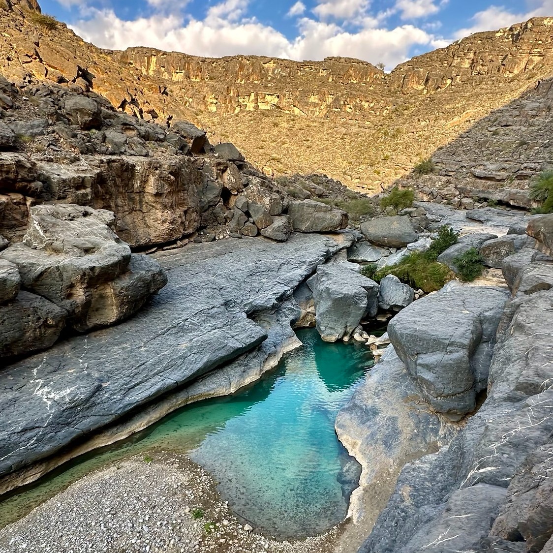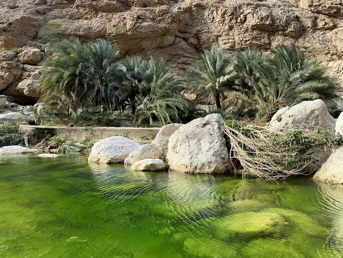 Our adventure started with a short boat ride (1 OMR per person ~2.5€) to cross the river. From there, a scenic 45-minutes walk leads us through a canyon filled with emerald-green waters. Some sections are slippery, so wear decent shoes. If you’re feeling adventurous, you can continue beyond the main pool, but we ran out of time. Yes, it’s touristy, but finding a quiet spot isn’t impossible. Bring a swimsuit—you will want to take a dip.